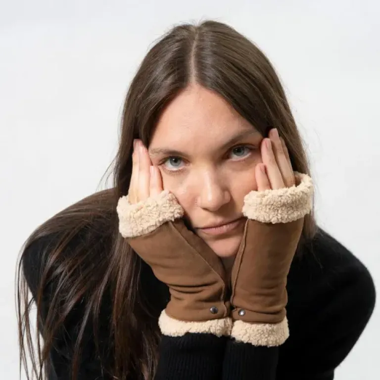Quand tu ouvres le paquet, tu te retrouves avec une paire de mitaines en cuir de chèvre velours, couleur cognac, doublées d’imitation fourrure. C’est du 100 % cuir à l’extérieur et 100 % polyester à l’intérieur. Pas de fermeture compliquée, c’est du "à enfiler" tout simple. La taille 7.5 correspond à un M, et sur une main féminine classique, ça tombe globalement bien, ni trop serré ni trop large, à condition de ne pas avoir des doigts très épais.